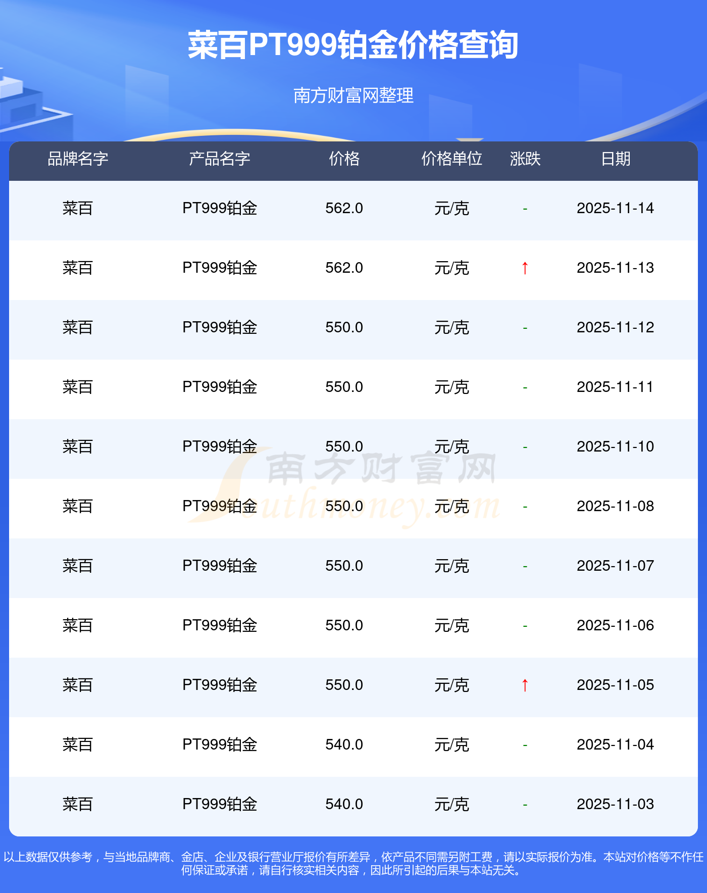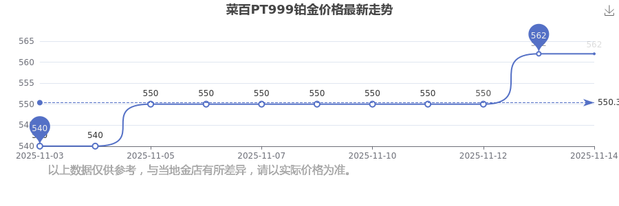 今日(2025年11月15日)菜百PT999鉑金價(jià)格是562.0元/克。