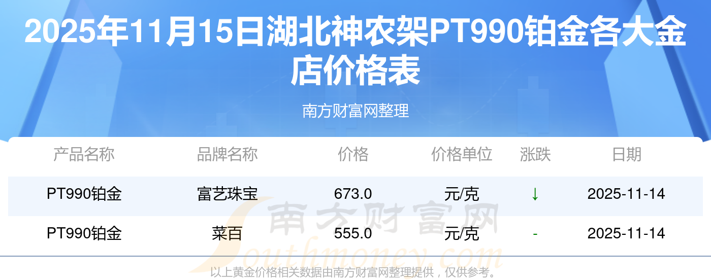 2025年11月15日湖北神農(nóng)架周大福、周大福、周大福、周大福、周大福、周大福、周大福、老鳳祥、老鳳祥、老鳳祥、周六福等各大金店品牌PT990鉑金最新價(jià)格如下:周大福黃金價(jià)格1333.0元/克,周大福鉑金價(jià)格646.0元/克,周大福飾品金價(jià)(內(nèi)地)1333.0元/克,周大福黃金飾品(香港)46320.0,周大福鉑金價(jià)格(香港)18410.0,周大福金條價(jià)格(香港)41780.0,周大福金條金價(jià)(內(nèi)地)1167.0元/克,老鳳祥黃金價(jià)格1322.0元/克,老鳳祥鉑金價(jià)格600.0元/克,老鳳祥足金價(jià)格1322.0元/克,周六福黃金價(jià)格1295.0元/克。