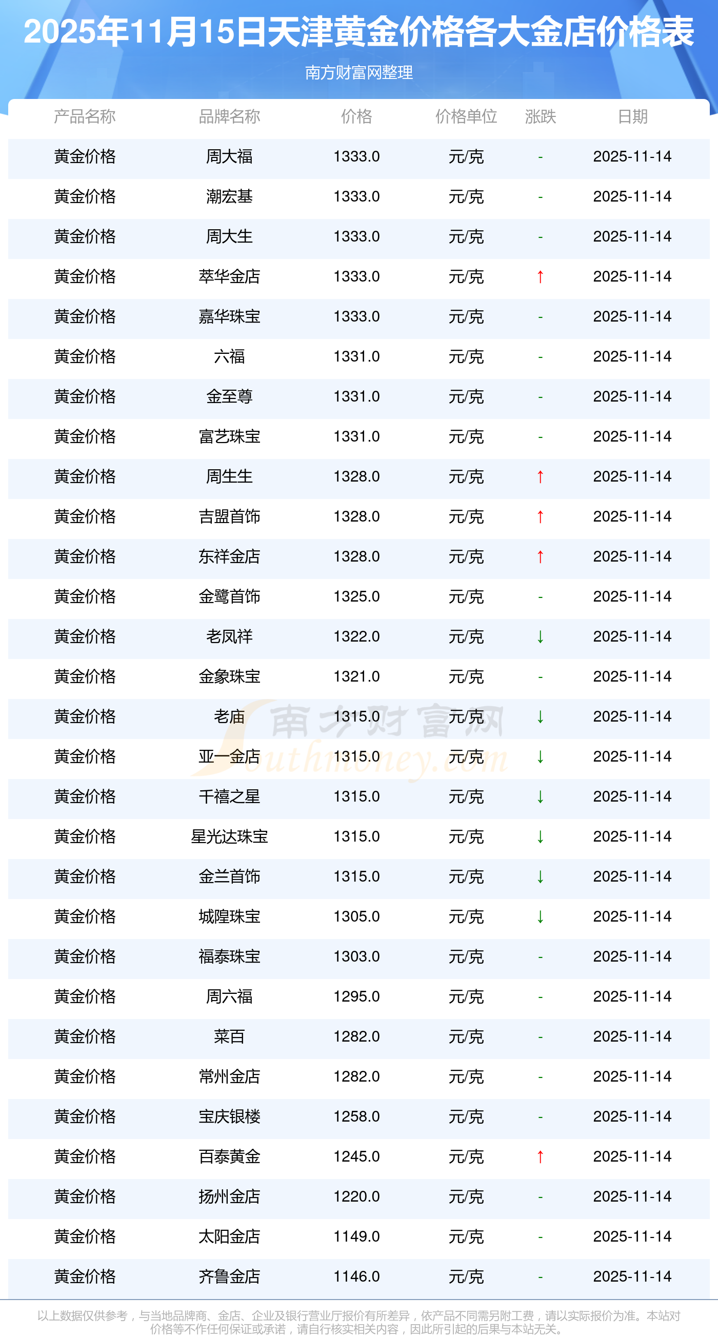 今天是2025年11月15日,天津周大福、周大福、周大福、周大福、周大福、周大福、周大福、老鳳祥、老鳳祥、老鳳祥、周六福等各大金店品牌黃金價(jià)格最新價(jià)格行情是這樣的:周大福1333.0元/克、周大福646.0元/克、周大福1333.0元/克、周大福46320.0、周大福18410.0、周大福41780.0、周大福1167.0元/克、老鳳祥1322.0元/克、老鳳祥600.0元/克、老鳳祥1322.0元/克、周六福1295.0元/克。