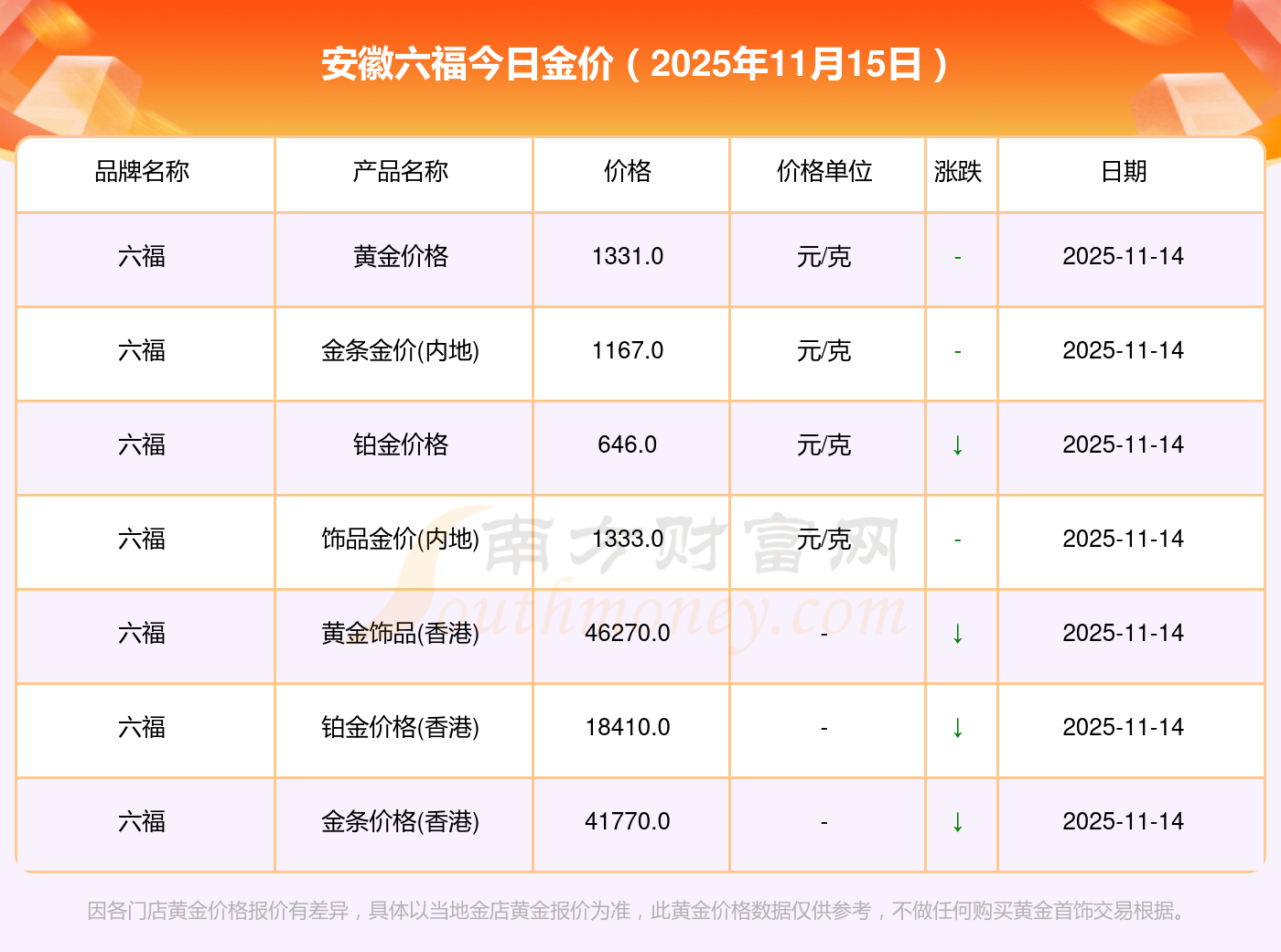 以上數(shù)據(jù)僅供參考,與當(dāng)?shù)仄放粕、金店、企業(yè)及銀行營業(yè)廳報價有所差異,依產(chǎn)品不同需另附工費,請以實際報價為準(zhǔn)。本站對價格等不作任何保證或承諾,請自行核實相關(guān)內(nèi)容,因此所引起的后果與本站無關(guān)。