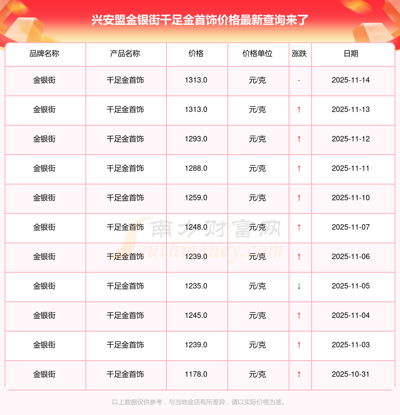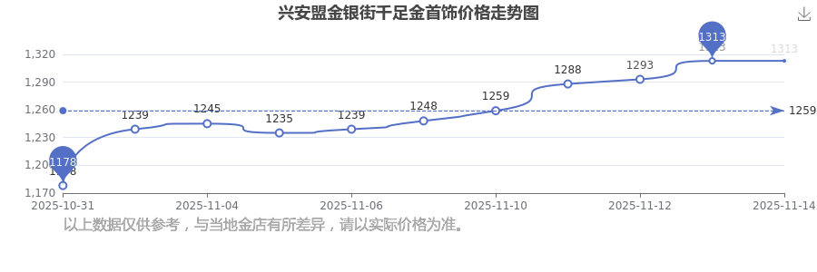 2025年11月15日這一天,興安盟金銀街的千足金首飾以 1313.0元/克的價格售賣。