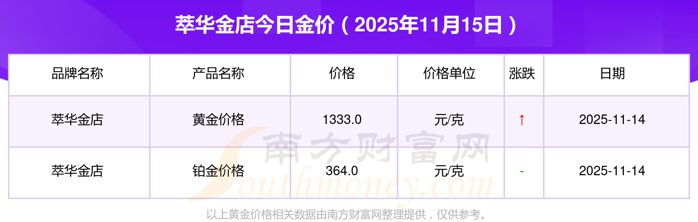 2025年11月15日萃華金店金價(jià)查詢:黃金價(jià)格1333.0元/克,鉑金價(jià)格646.0元/克,飾品金價(jià)(內(nèi)地)1333.0元/克,黃金飾品(香港)46320.0,鉑金價(jià)格(香港)18410.0,金條價(jià)格(香港)41780.0,金條金價(jià)(內(nèi)地)1167.0元/克,黃金價(jià)格1322.0元/克,鉑金價(jià)格600.0元/克,足金價(jià)格1322.0元/克,黃金價(jià)格1295.0元/克。