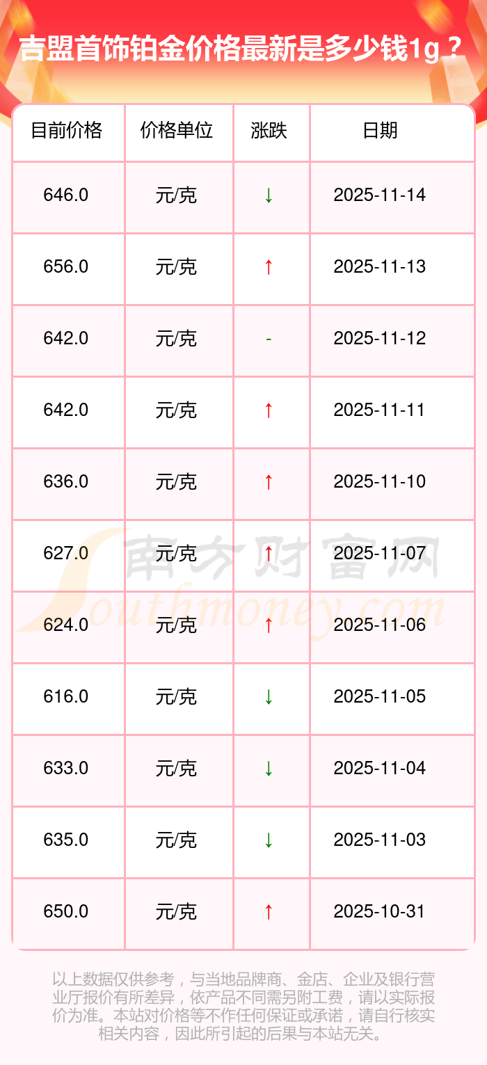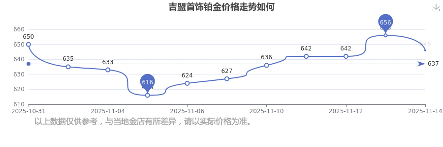 今日吉盟首飾鉑金價格為646.0元/克。