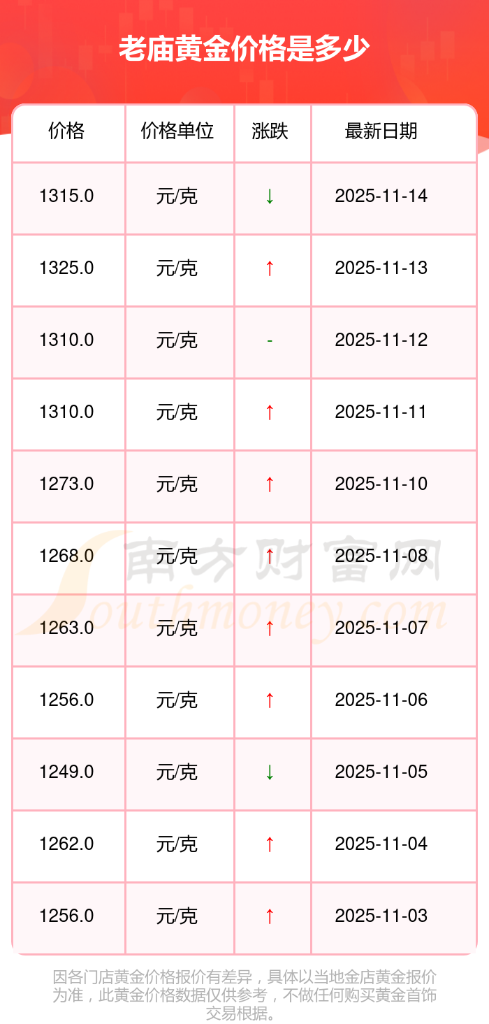 今天黃金價(jià)位怎樣呢?現(xiàn)在每克黃金賣多少錢?黃金每克的價(jià)格大概是多少范圍?今日老廟 黃金價(jià)格最新的市場標(biāo)價(jià)為1315.0元/克。