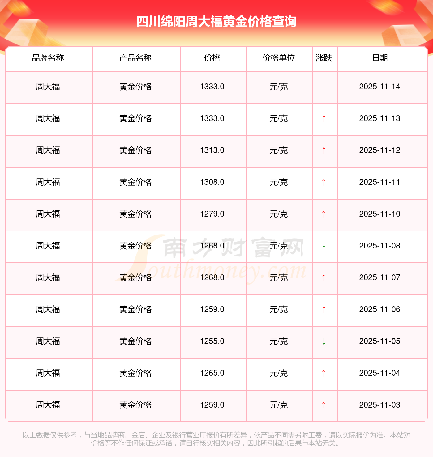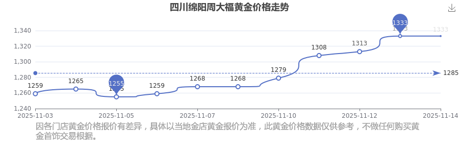 今日四川綿陽周大福黃金價格最新價格是1333.0元/克。