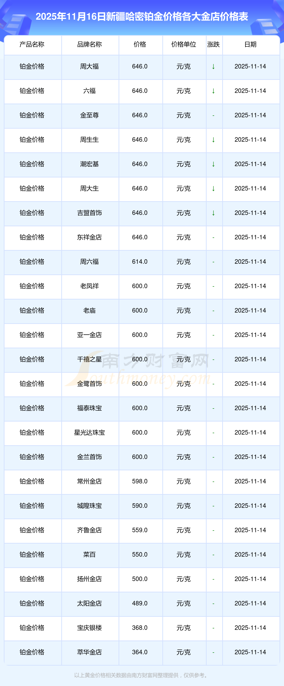 今天是2025年11月16日,新疆哈密周大福、周大福、周大福、周大福、周大福、周大福、周大福、老鳳祥、老鳳祥、老鳳祥、周六福等各大金店品牌鉑金價格最新價格行情是這樣的:周大福1333.0元/克、周大福646.0元/克、周大福1333.0元/克、周大福46320.0、周大福18410.0、周大福41780.0、周大福1167.0元/克、老鳳祥1322.0元/克、老鳳祥600.0元/克、老鳳祥1322.0元/克、周六福1295.0元/克。