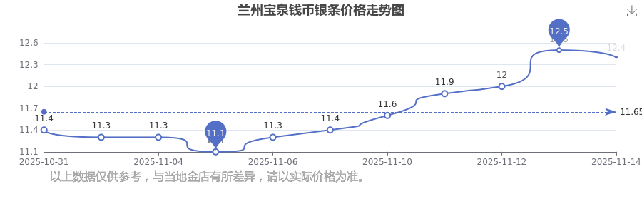 2025年11月16日,蘭州寶泉錢幣銀條價(jià)格每克的售賣價(jià)位為12.4元/克。