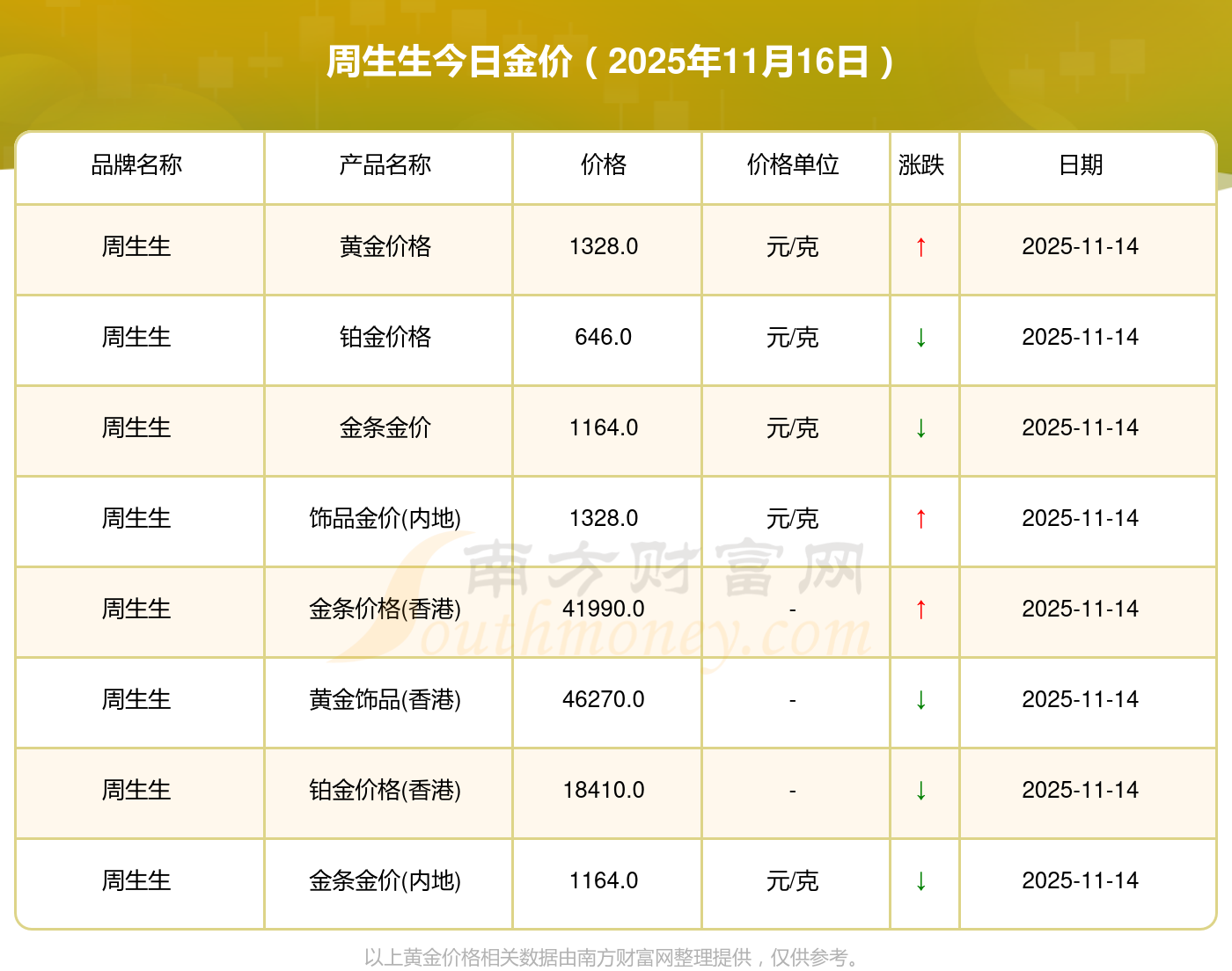 2025年11月16日周生生今日價(jià)格:黃金價(jià)格1333.0元/克,鉑金價(jià)格646.0元/克,飾品金價(jià)(內(nèi)地)1333.0元/克,黃金飾品(香港)46320.0,鉑金價(jià)格(香港)18410.0,金條價(jià)格(香港)41780.0,金條金價(jià)(內(nèi)地)1167.0元/克,黃金價(jià)格1322.0元/克,鉑金價(jià)格600.0元/克,足金價(jià)格1322.0元/克,黃金價(jià)格1295.0元/克。