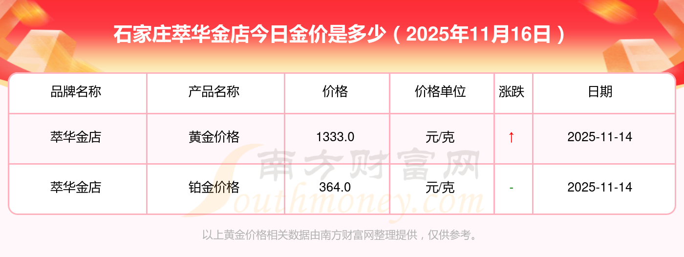 2025年11月16日石家莊萃華金店黃金的單價(jià),一克為多少?黃金價(jià)格1333.0元/克,鉑金價(jià)格646.0元/克,飾品金價(jià)(內(nèi)地)1333.0元/克,黃金飾品(香港)46320.0,鉑金價(jià)格(香港)18410.0,金條價(jià)格(香港)41780.0,金條金價(jià)(內(nèi)地)1167.0元/克,黃金價(jià)格1322.0元/克,鉑金價(jià)格600.0元/克,足金價(jià)格1322.0元/克,黃金價(jià)格1295.0元/克。