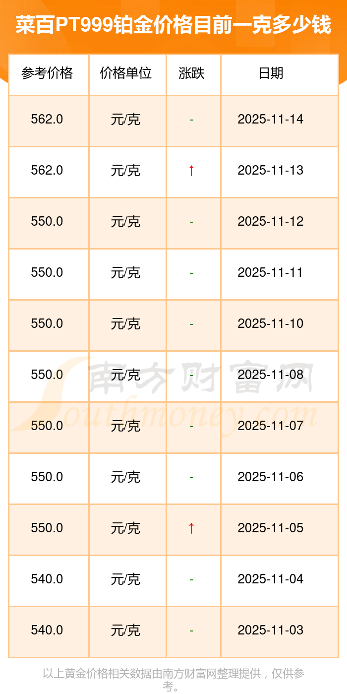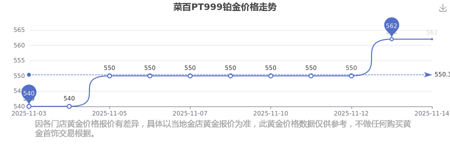 菜百 PT999鉑金在今日的最新價(jià)格顯示為562.0元/克。
