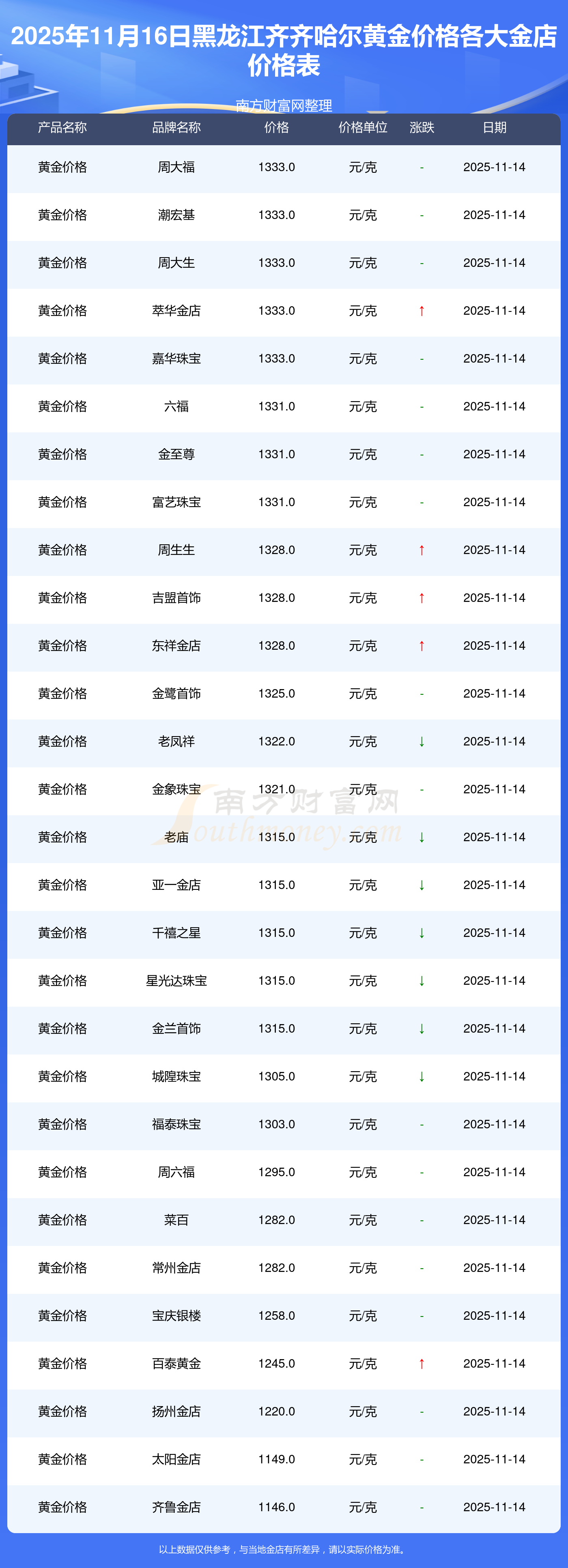 2025年11月16日黑龍江齊齊哈爾各大金店黃金價格最新價格:周大福1333.0元/克,周大福646.0元/克,周大福1333.0元/克,周大福46320.0,周大福18410.0,周大福41780.0,周大福1167.0元/克,老鳳祥1322.0元/克,老鳳祥600.0元/克,老鳳祥1322.0元/克,周六福1295.0元/克。
