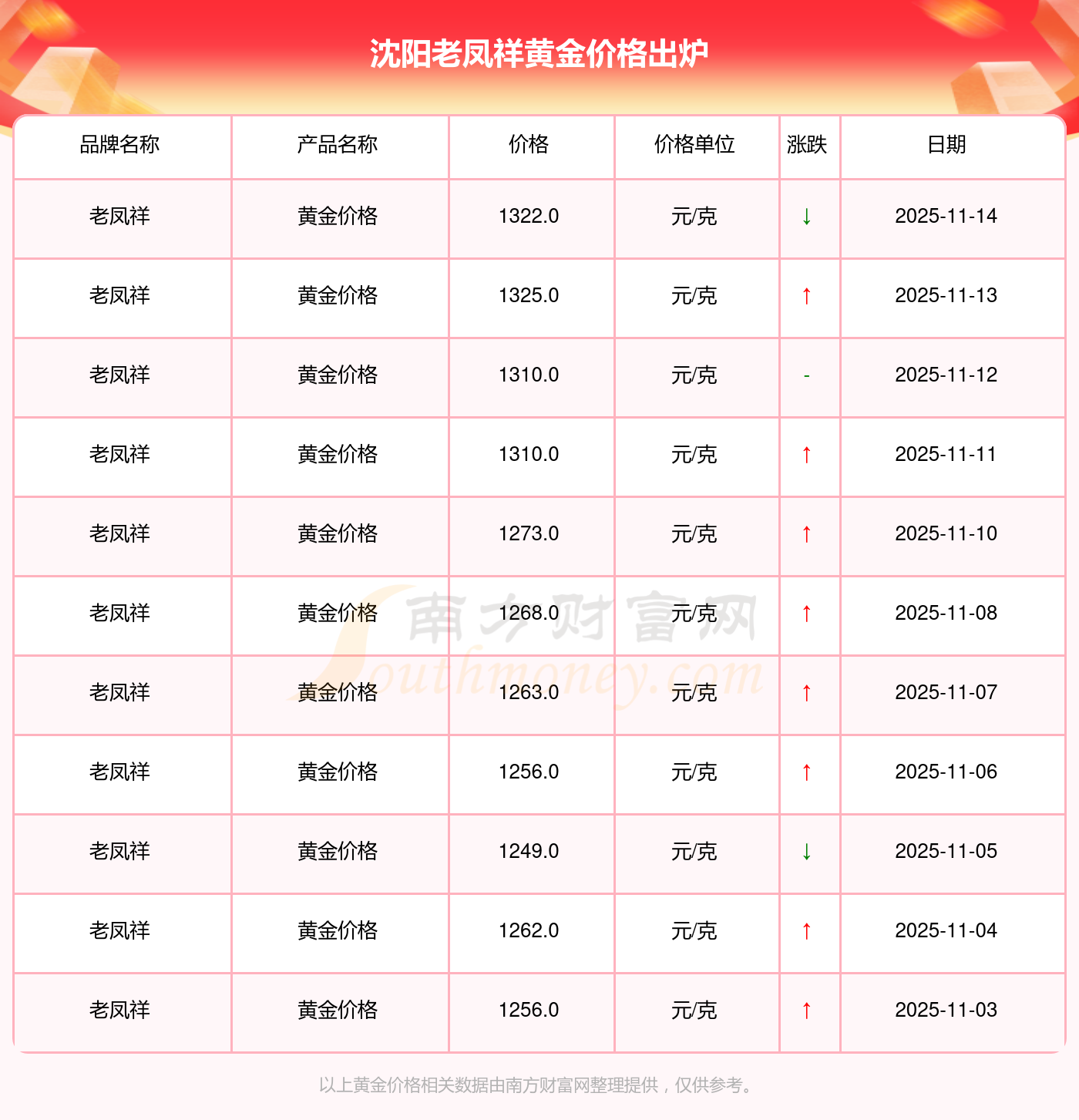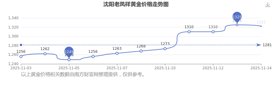 2025年11月16日沈陽老鳳祥黃金價(jià)格為1322.0元/克。