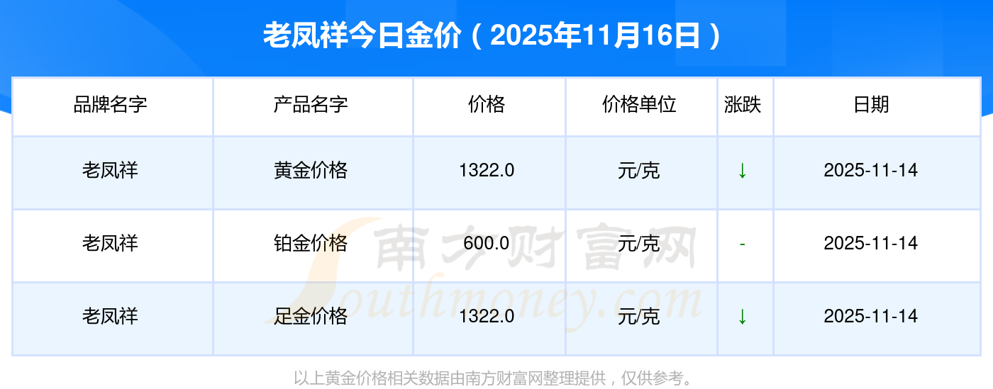 2025年11月16日老鳳祥今日價(jià)格:黃金價(jià)格1333.0元/克,鉑金價(jià)格646.0元/克,飾品金價(jià)(內(nèi)地)1333.0元/克,黃金飾品(香港)46320.0,鉑金價(jià)格(香港)18410.0,金條價(jià)格(香港)41780.0,金條金價(jià)(內(nèi)地)1167.0元/克,黃金價(jià)格1322.0元/克,鉑金價(jià)格600.0元/克,足金價(jià)格1322.0元/克,黃金價(jià)格1295.0元/克。