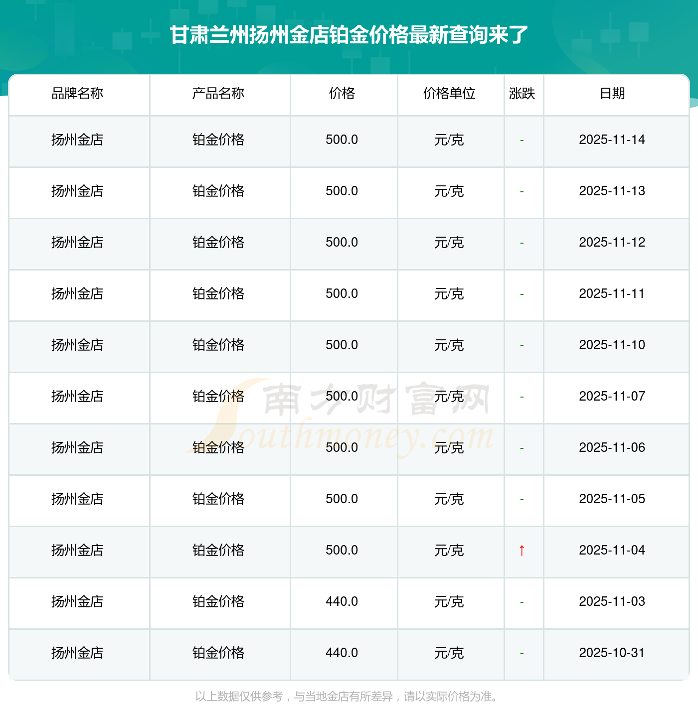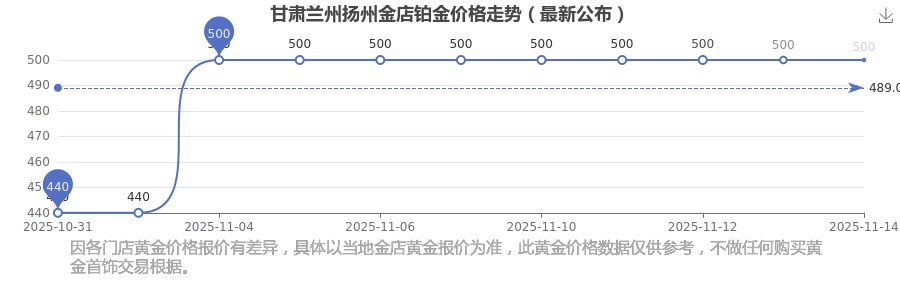 2025年11月16日,甘肅蘭州揚州金店所售鉑金價格,其價格設(shè)定為 500.0元/克。