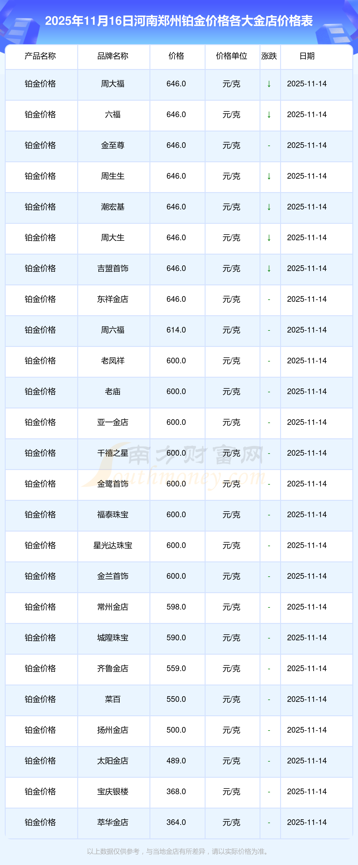 2025年11月16日,河南鄭州周大福、周大福、周大福、周大福、周大福、周大福、周大福、老鳳祥、老鳳祥、老鳳祥、周六福等各大金店品牌鉑金價(jià)格今日價(jià)格行情最新來(lái)了:周大福1333.0元/克、周大福646.0元/克、周大福1333.0元/克、周大福46320.0、周大福18410.0、周大福41780.0、周大福1167.0元/克、老鳳祥1322.0元/克、老鳳祥600.0元/克、老鳳祥1322.0元/克、周六福1295.0元/克。