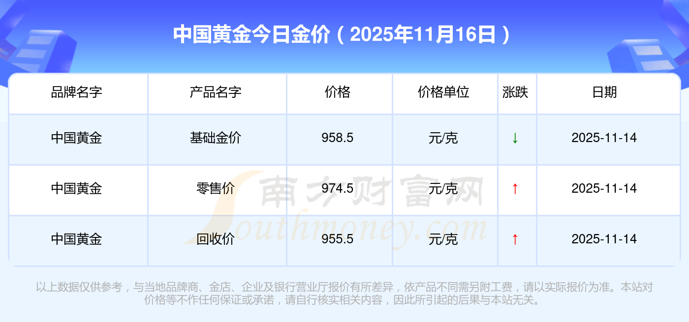 2025年11月16日中國(guó)黃金金價(jià)查詢:黃金價(jià)格1333.0元/克,鉑金價(jià)格646.0元/克,飾品金價(jià)(內(nèi)地)1333.0元/克,黃金飾品(香港)46320.0,鉑金價(jià)格(香港)18410.0,金條價(jià)格(香港)41780.0,金條金價(jià)(內(nèi)地)1167.0元/克,黃金價(jià)格1322.0元/克,鉑金價(jià)格600.0元/克,足金價(jià)格1322.0元/克,黃金價(jià)格1295.0元/克。