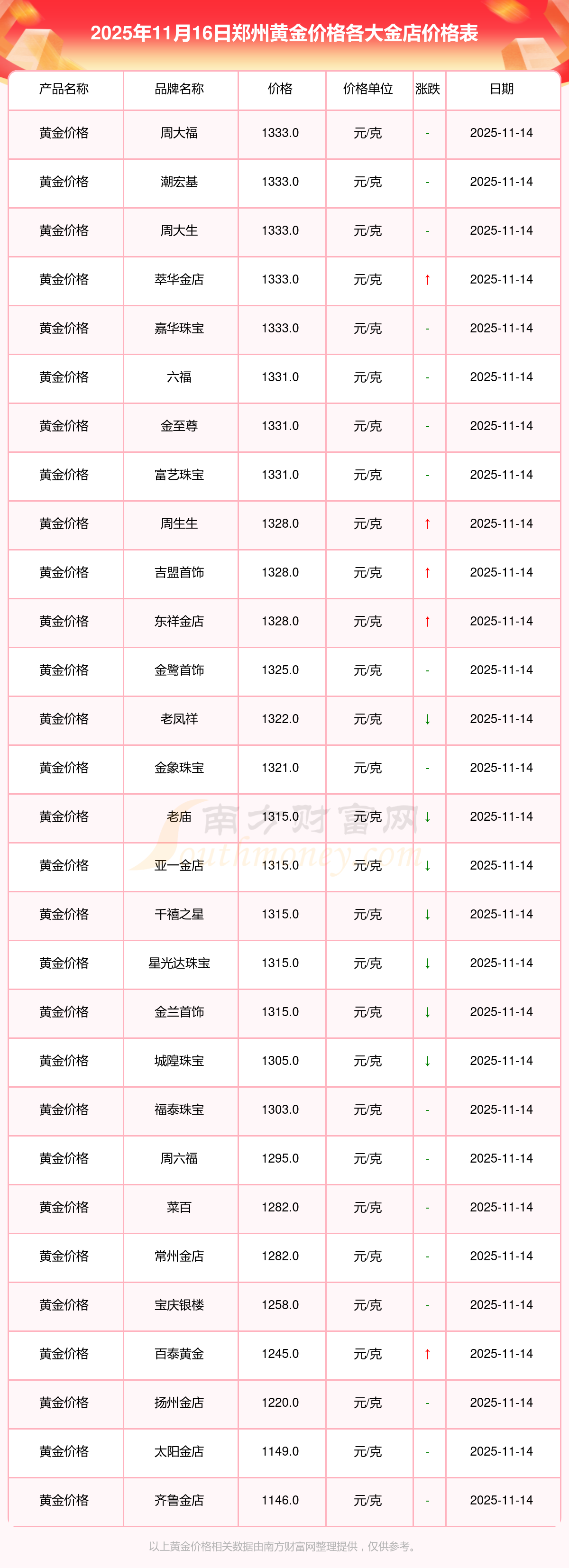 2025年11月16日鄭州各大金店黃金價(jià)格最新價(jià)格查詢來了:周大福1333.0元/克,周大福646.0元/克,周大福1333.0元/克,周大福46320.0,周大福18410.0,周大福41780.0,周大福1167.0元/克,老鳳祥1322.0元/克,老鳳祥600.0元/克,老鳳祥1322.0元/克,周六福1295.0元/克。