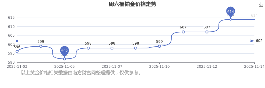 今日周六福鉑金價格為614.0元/克。