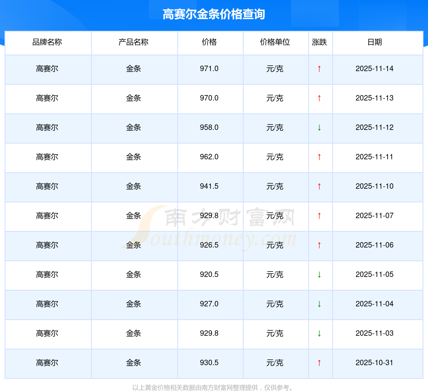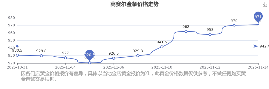 今日高賽爾 金條最新的克重售價為971.0元/克。