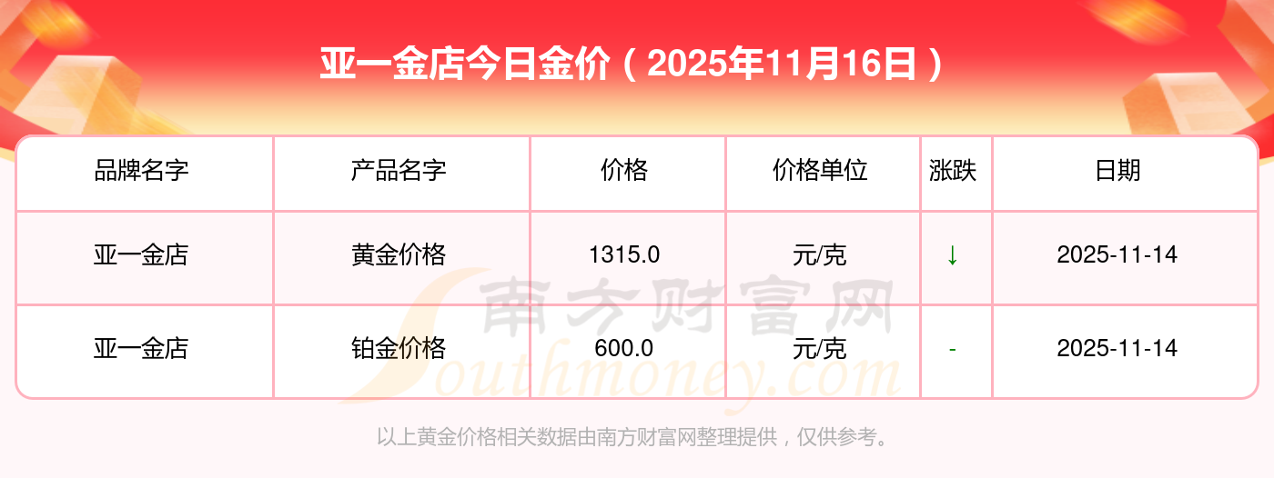 現(xiàn)在亞一金店黃金價格是多少錢1克_2025年亞一金店今日金價是多少錢一克,最新亞一金店查詢,2025年11月16日亞一金店黃金價格現(xiàn)在每克多少錢?最新亞一金店黃金價格報價公布,一起來看看吧!