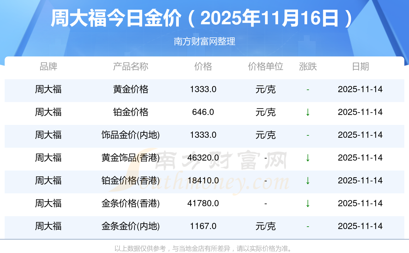 2025年11月16日周大福、周大福、周大福、周大福、周大福、周大福、周大福、老鳳祥、老鳳祥、老鳳祥、周六福等各大金店品牌黃金價格最新價格如下:周大福黃金價格1333.0元/克,周大福鉑金價格646.0元/克,周大福飾品金價(內(nèi)地)1333.0元/克,周大福黃金飾品(香港)46320.0,周大福鉑金價格(香港)18410.0,周大福金條價格(香港)41780.0,周大福金條金價(內(nèi)地)1167.0元/克,老鳳祥黃金價格1322.0元/克,老鳳祥鉑金價格600.0元/克,老鳳祥足金價格1322.0元/克,周六福黃金價格1295.0元/克。
