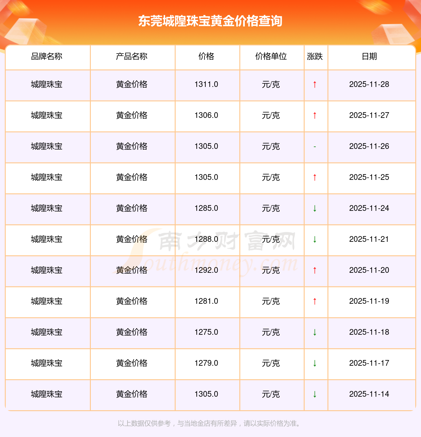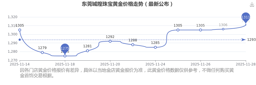 今日(2025年11月30日)東莞城隍珠寶黃金價(jià)格最新價(jià)格為1311.0元/克。
