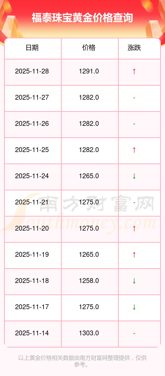 今日福泰珠寶黃金價(jià)格最新為1291.0元/克。
