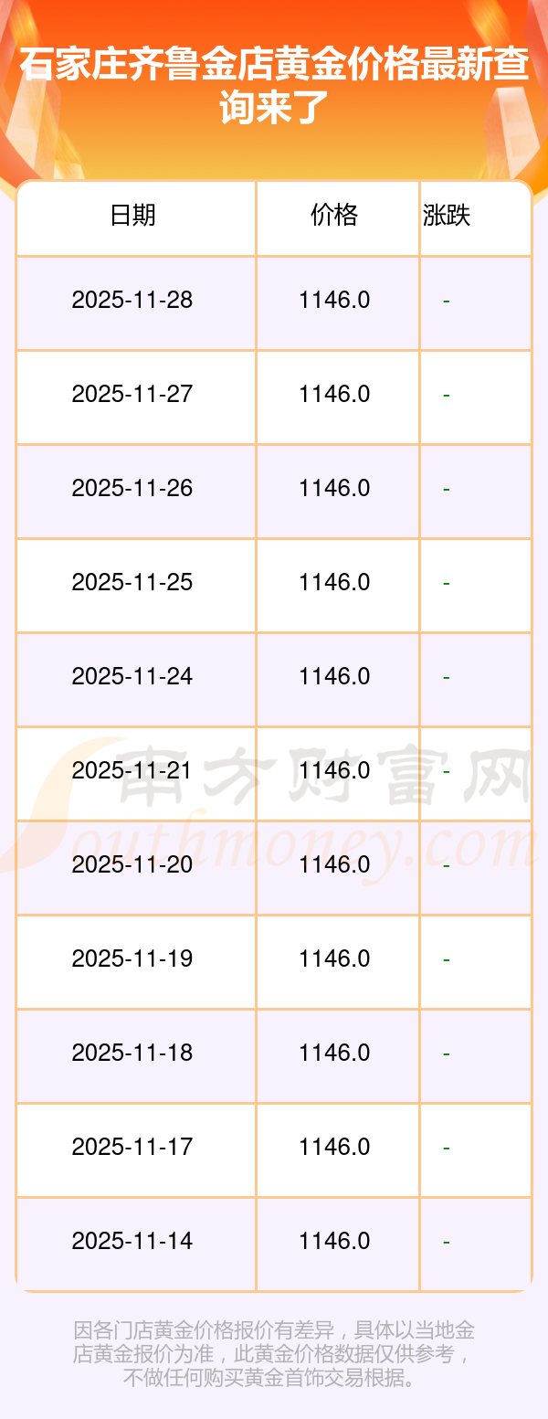 (2025年11月30日)今日石家莊齊魯金店黃金價格是1146.0元/克。