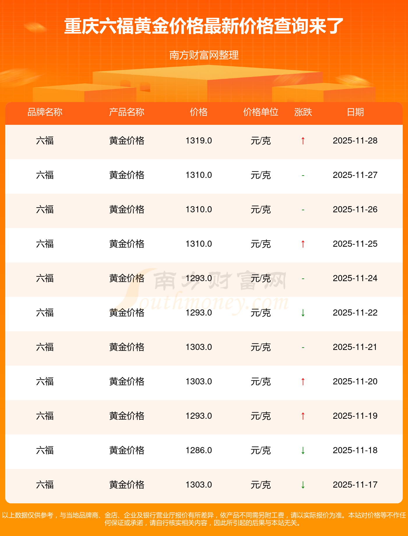 今天是2025年11月30日,星光達珠寶、星光達珠寶、寶泉錢幣、金蘭首飾、金蘭首飾、謝瑞麟、謝瑞麟、謝瑞麟、謝瑞麟、謝瑞麟、金銀街等各大金店品牌黃金價格最新價格如下:星光達珠寶1321.0元/克、星光達珠寶600.0元/克、寶泉錢幣12.6元/克、金蘭首飾1321.0元/克、金蘭首飾600.0元/克、謝瑞麟1207.0元/克、謝瑞麟1321.0元/克、謝瑞麟46370.0、謝瑞麟13970.0、謝瑞麟41860.0、金銀街1296.0元/克。