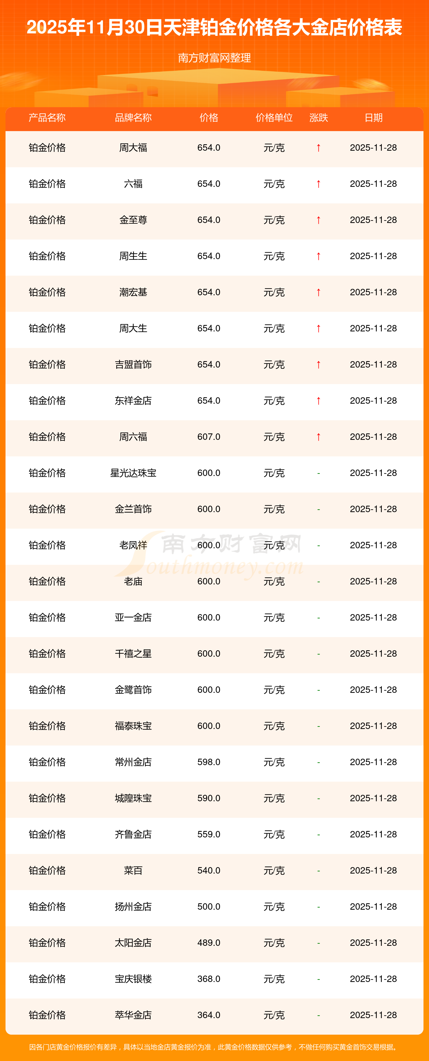 今天是2025年11月30日,天津星光達珠寶、星光達珠寶、寶泉錢幣、金蘭首飾、金蘭首飾、謝瑞麟、謝瑞麟、謝瑞麟、謝瑞麟、謝瑞麟、金銀街等各大金店品牌鉑金價格最新價格行情是這樣的:星光達珠寶1321.0元/克、星光達珠寶600.0元/克、寶泉錢幣12.6元/克、金蘭首飾1321.0元/克、金蘭首飾600.0元/克、謝瑞麟1207.0元/克、謝瑞麟1321.0元/克、謝瑞麟46370.0、謝瑞麟13970.0、謝瑞麟41860.0、金銀街1296.0元/克。