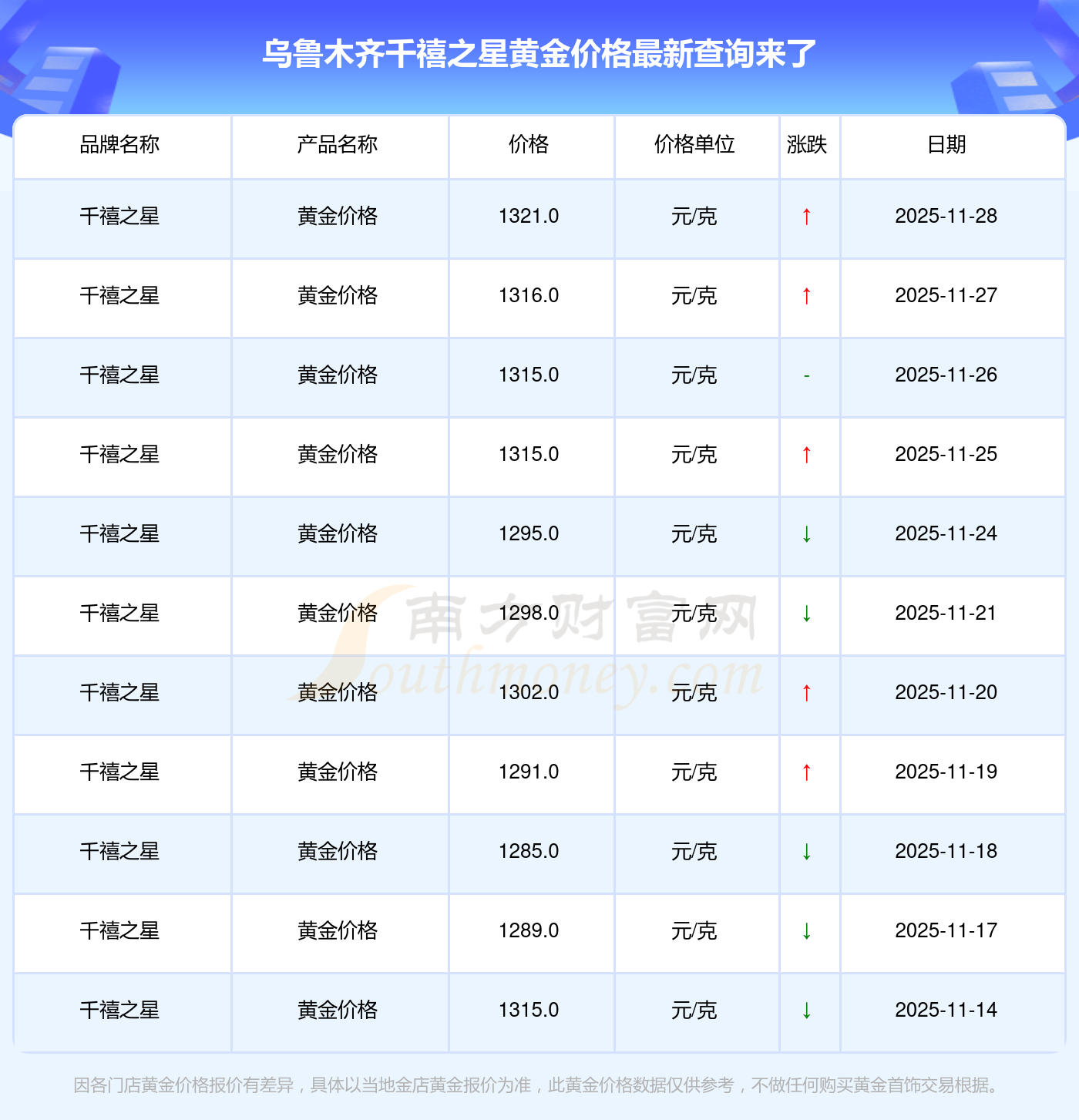 2025年11月30日各大金店黃金價格最新價格:星光達珠寶1321.0元/克,星光達珠寶600.0元/克,寶泉錢幣12.6元/克,金蘭首飾1321.0元/克,金蘭首飾600.0元/克,謝瑞麟1207.0元/克,謝瑞麟1321.0元/克,謝瑞麟46370.0,謝瑞麟13970.0,謝瑞麟41860.0,金銀街1296.0元/克。