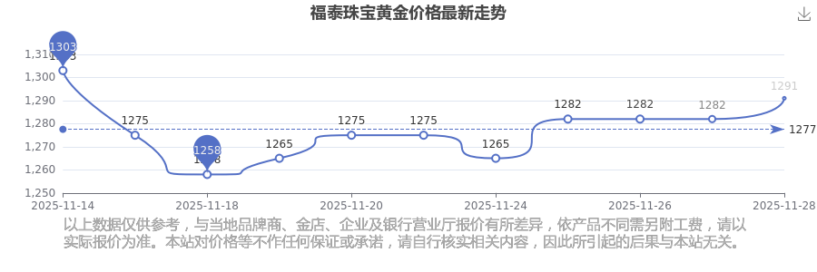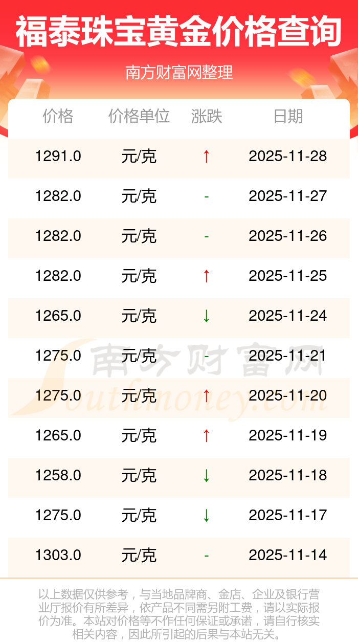 今天黃金價(jià)位怎樣呢?現(xiàn)在每克黃金賣多少錢?黃金每一克的價(jià)位大概是多少呢?2025年11月30日福泰珠寶黃金價(jià)格最新為1291.0元/克。