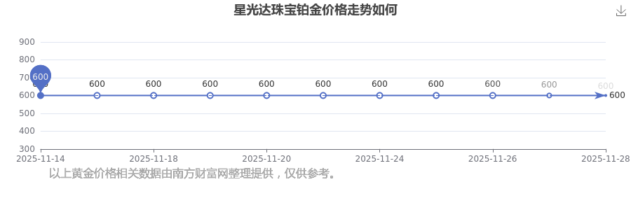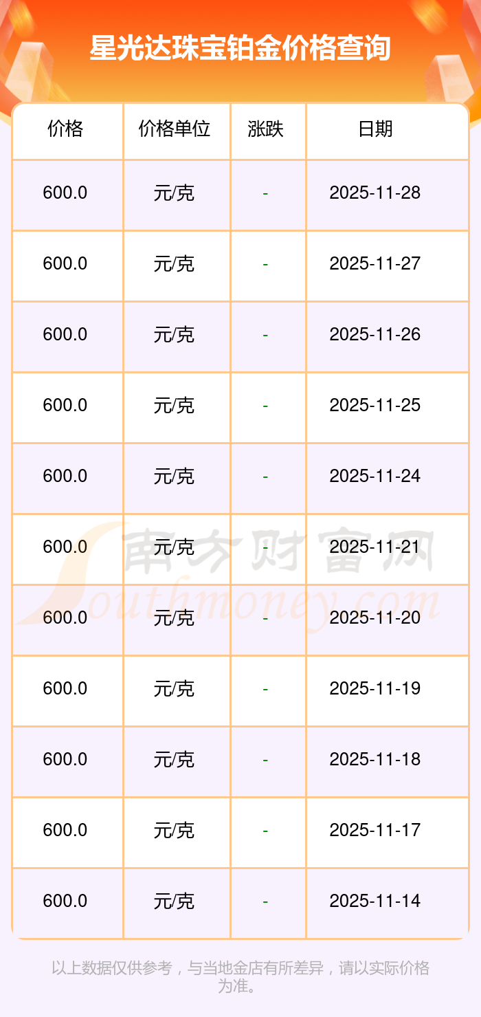 2025年11月30日星光達(dá)珠寶鉑金價(jià)格:600.0元/克。