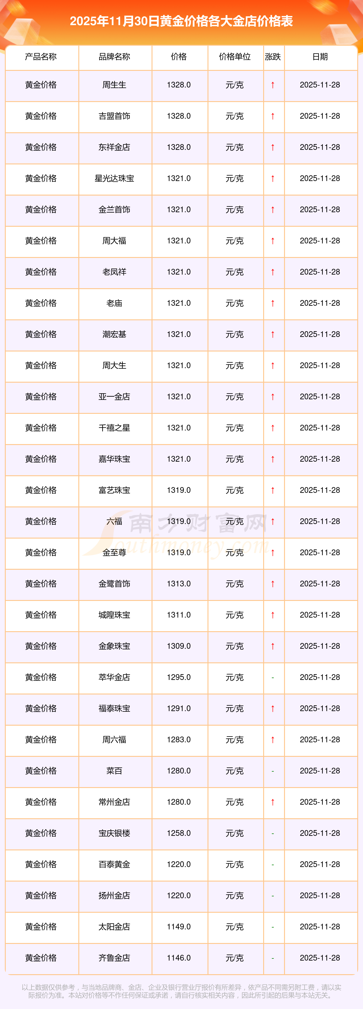 2025年11月30日各大金店黃金價格多少一克?各大金店黃金價格報價一覽表,一起來看看吧!
