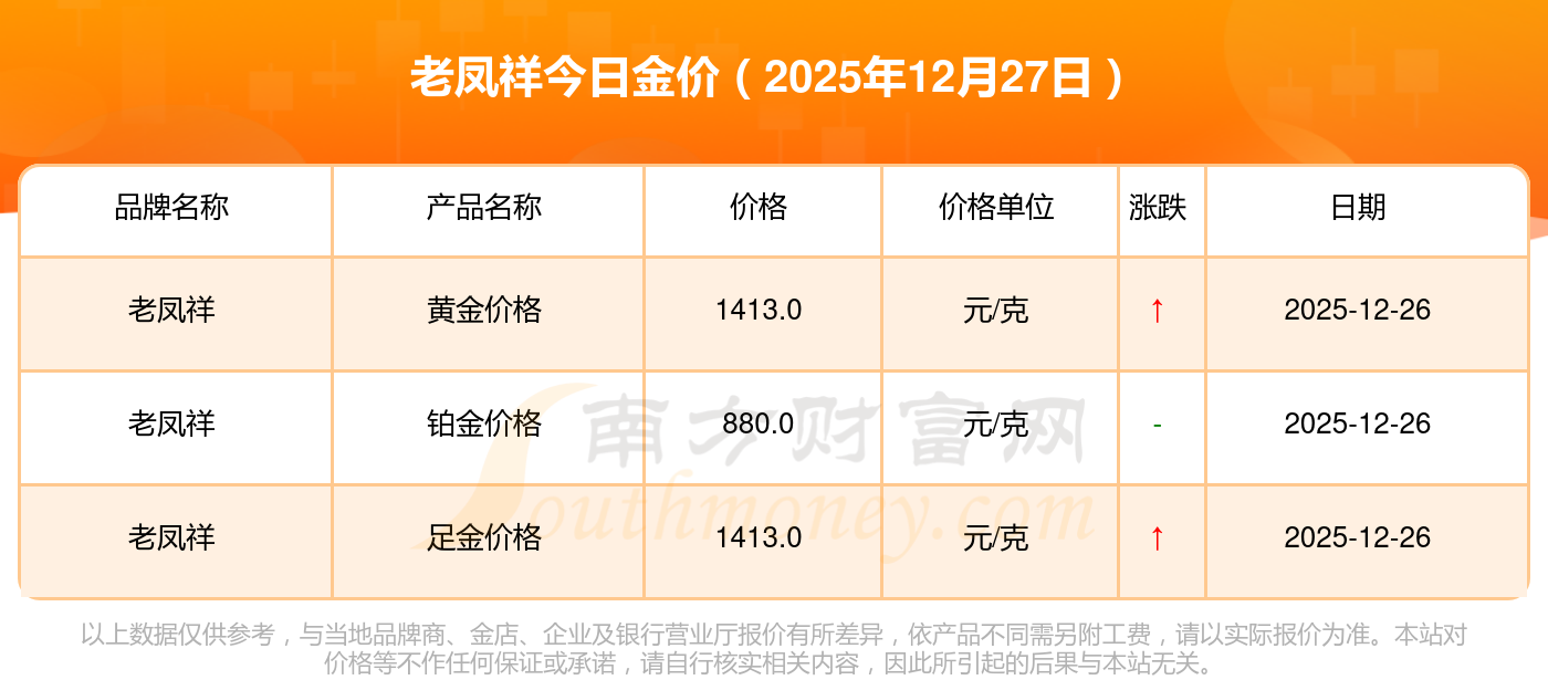 因各門(mén)店黃金價(jià)格報(bào)價(jià)有差異,具體以當(dāng)?shù)亟鸬挈S金報(bào)價(jià)為準(zhǔn),此黃金價(jià)格數(shù)據(jù)僅供參考,不做任何購(gòu)買(mǎi)黃金首飾交易根據(jù)。