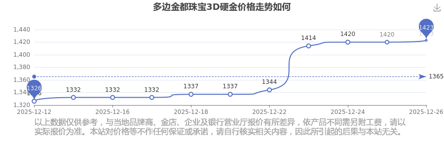 今日多邊金都珠寶3D硬金價(jià)格:1423.0元/克。
