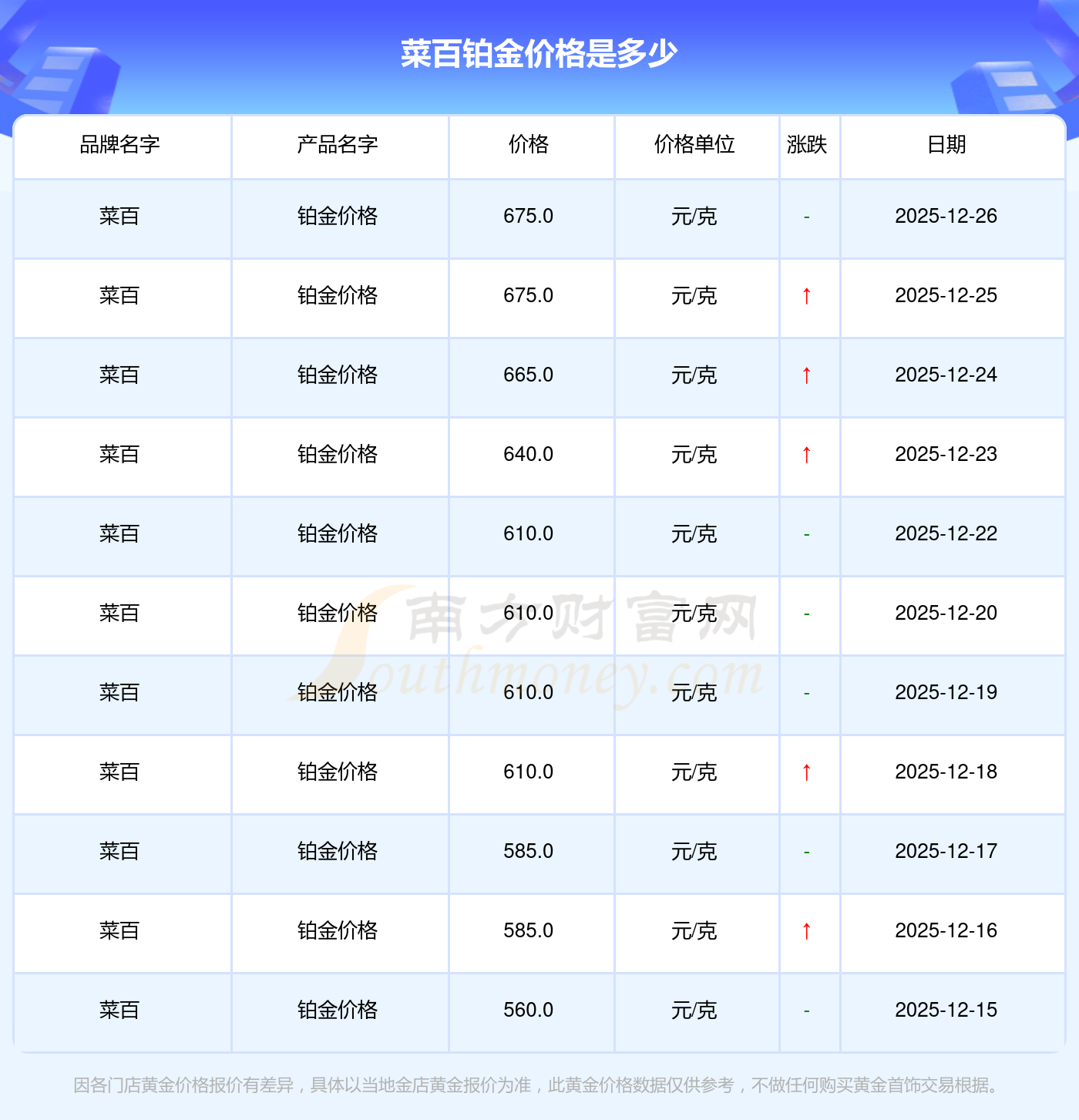 2025年12月28日菜百鉑金價格查詢:675.0元/克。