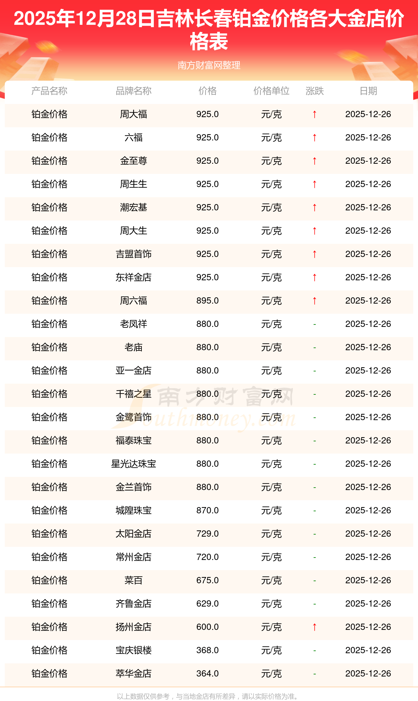 2025年12月28日吉林長春各大金店鉑金價格最新價格查詢來了:周大福1398.0元/克,老鳳祥1413.0元/克,老廟1413.0元/克,周生生1407.0元/克,周大福925.0元/克,周大福1413.0元/克,周大福50280.0,周大福27110.0,周大福45210.0,周大福1239.0元/克,老鳳祥880.0元/克。