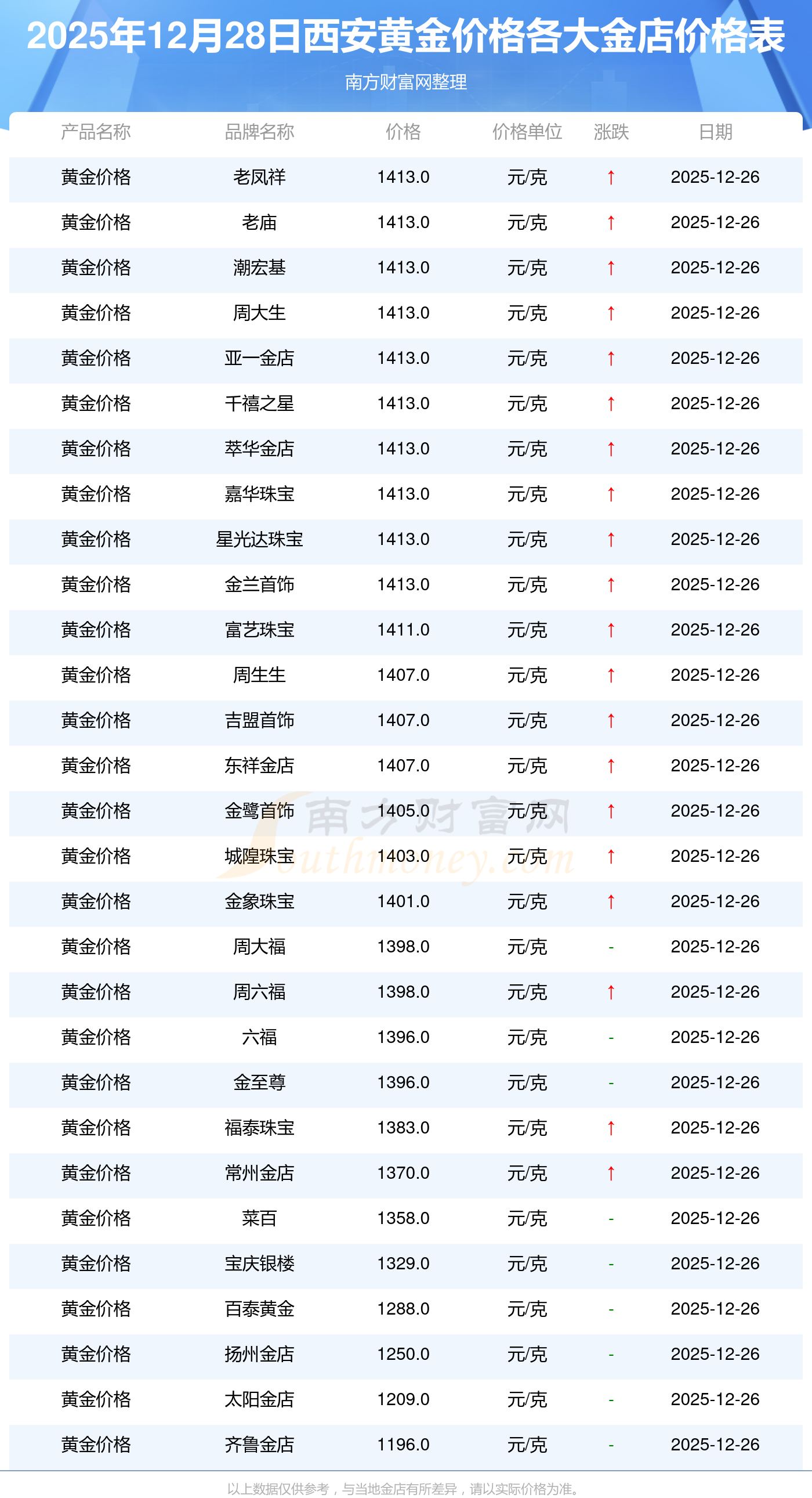 今天是2025年12月28日,西安周大福、老鳳祥、老廟、周生生、周大福、周大福、周大福、周大福、周大福、周大福、老鳳祥等各大金店品牌黃金價(jià)格最新價(jià)格如下:周大福1398.0元/克、老鳳祥1413.0元/克、老廟1413.0元/克、周生生1407.0元/克、周大福925.0元/克、周大福1413.0元/克、周大福50280.0、周大福27110.0、周大福45210.0、周大福1239.0元/克、老鳳祥880.0元/克。
