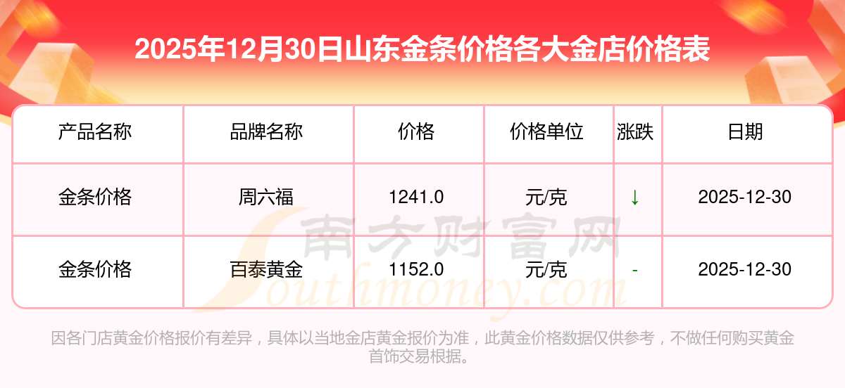 2025年12月30日山東各大金店金條價(jià)格最新價(jià)格:周大福1363.0元/克,老鳳祥1363.0元/克,老廟1359.0元/克,周生生1353.0元/克,周大福871.0元/克,周大福1363.0元/克,周大福48540.0,周大福24980.0,周大福43690.0,周大福1195.0元/克,老鳳祥920.0元/克。