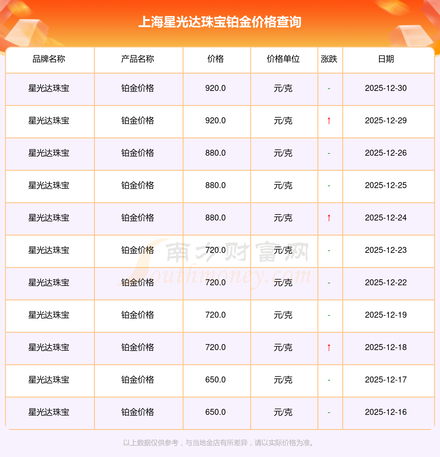 今日上海星光達(dá)珠寶鉑金價(jià)格最新為:920.0元/克。