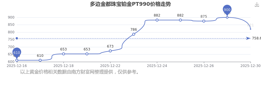 多邊金都珠寶 鉑金PT990價格在今日更新至821.0元/克。