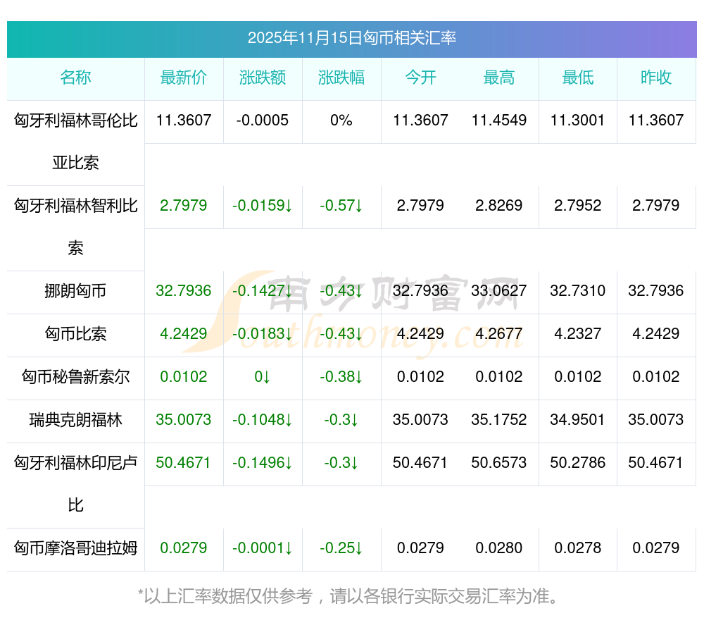 根據2025年11月15日匯率計算,HUF兌換BRL匯率最新價0.016012,今開價0.0160,昨收價0.0160,最高價0.0161,最低價0.0159。