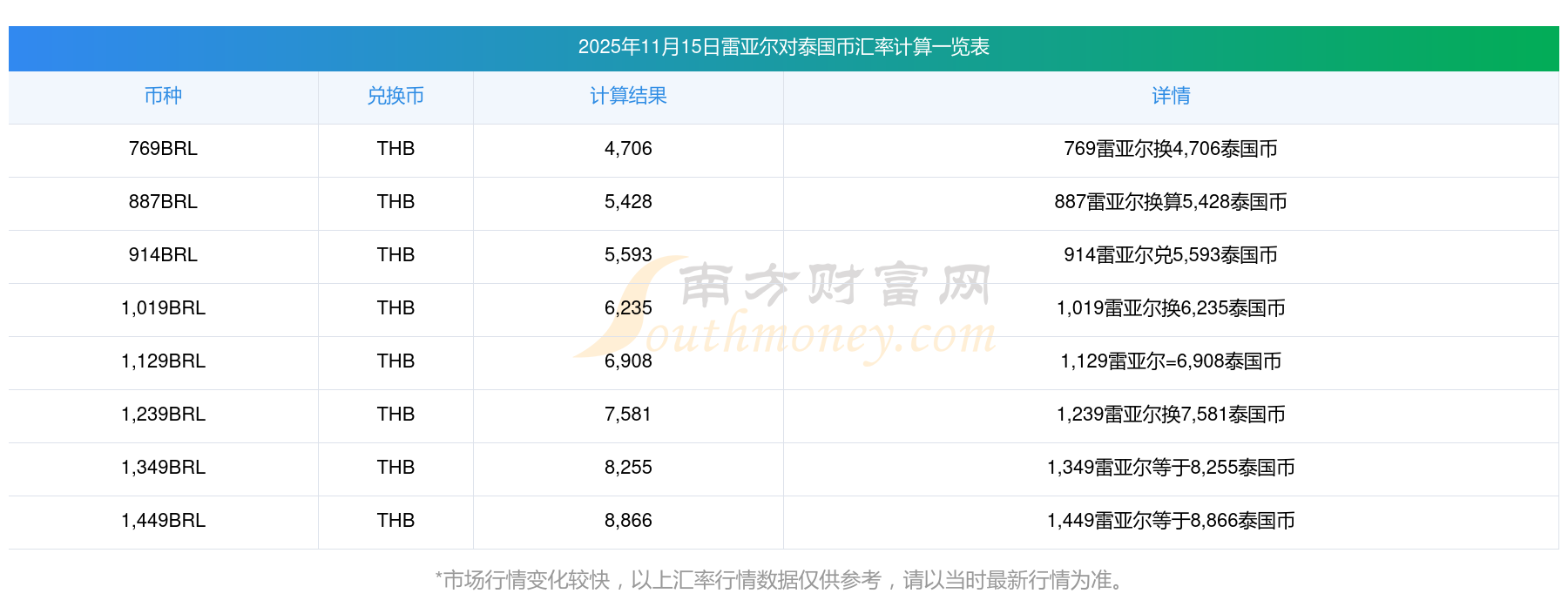 南方財富網為您提供雷亞爾對泰國幣匯率最新價格詳情。