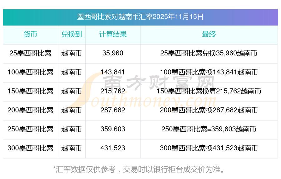 南方財(cái)富網(wǎng)為您提供墨西哥比索對(duì)越南幣匯率最新價(jià)格詳情。