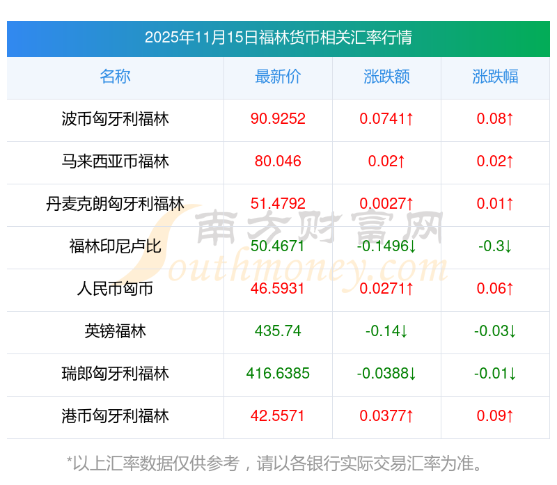 根據(jù)2025年11月15日匯率,福林兌換加元匯率最新0.004240,今開0.0042,昨收0.0042,最高0.0043,最低0.0042。