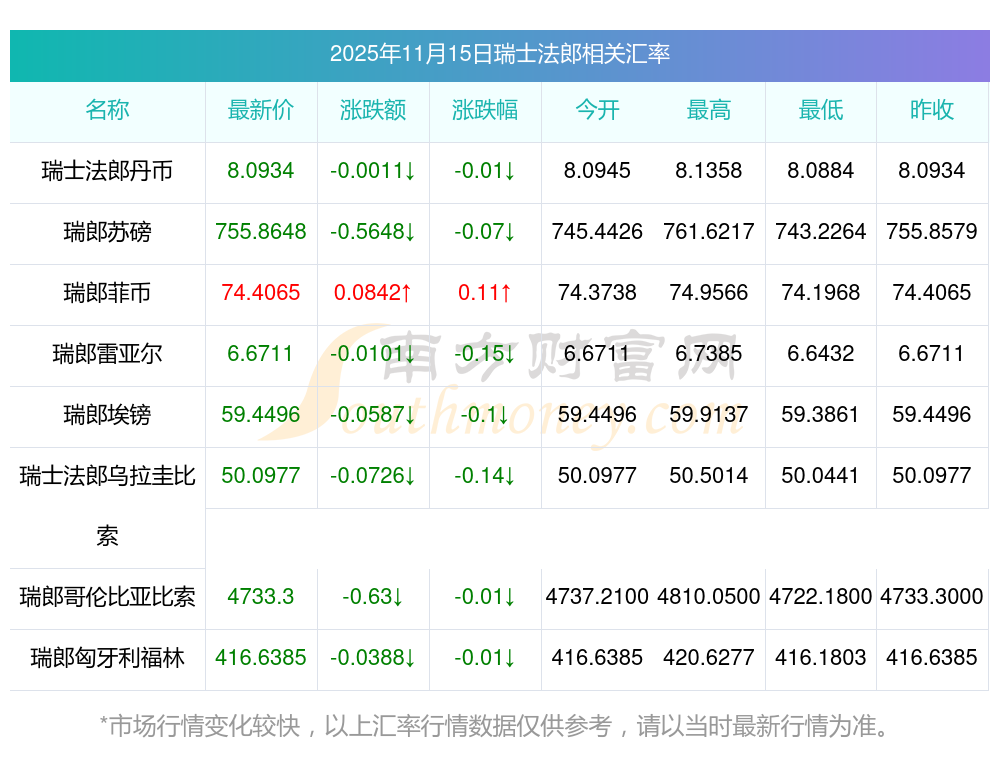 2025年11月15日瑞士法郎相關(guān)匯率查詢