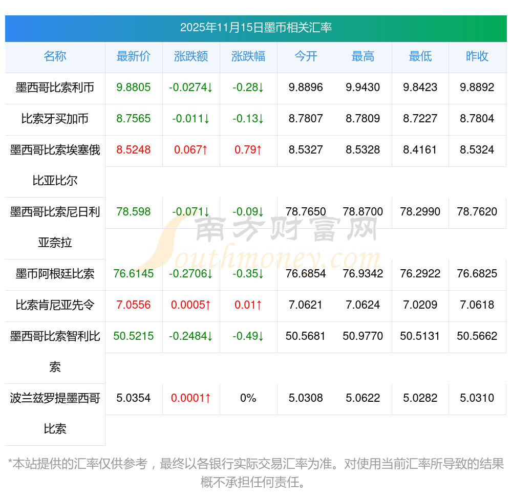 根據(jù)2025年11月15日匯率計算,MXN兌換PEN匯率最新價0.183700,今開價0.1838,昨收價0.1838,最高價0.1843,最低價0.1832。