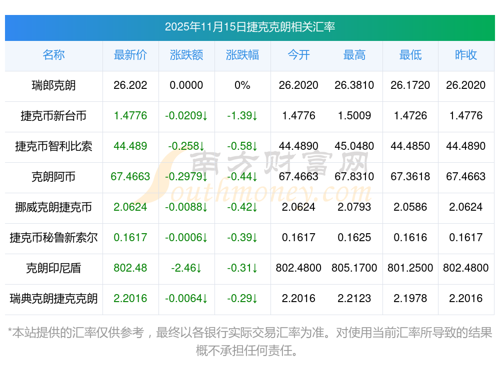 2025年11月15日捷克克朗相關(guān)匯率查詢