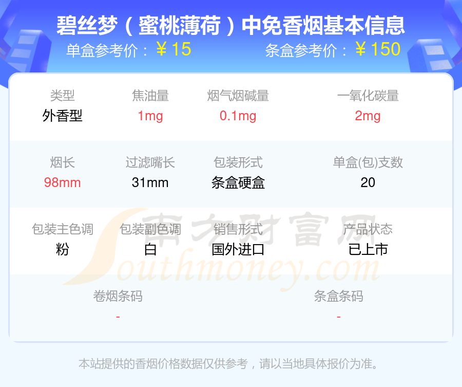 本站提供的香煙價格數(shù)據(jù)僅供參考,請以當?shù)鼐唧w報價為準。